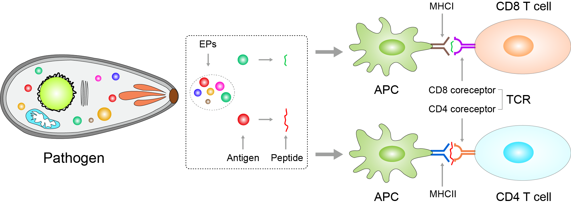 Once a successful infection established, eukaryotic pathogens such as protozal parasites can generate various excretory products (EPs), which include the excretory antigens. T-cell epitopes are peptides derived from excretory protein antigens and can be recognized by the T-cell receptor (TCR) when bind to the MHC molecules located on the face of antigen presenting cell (APC). TCR expressed by CD8 T-cells is CD8 coreceptor, which can bind to the MHC I and recognize antigen peptide presented by MHC I molecules; TCR expressed by CD4 T-cells is CD4 coreceptor, which can bind to the MHC II and recognize antigen peptide presented by MHC II molecules. |